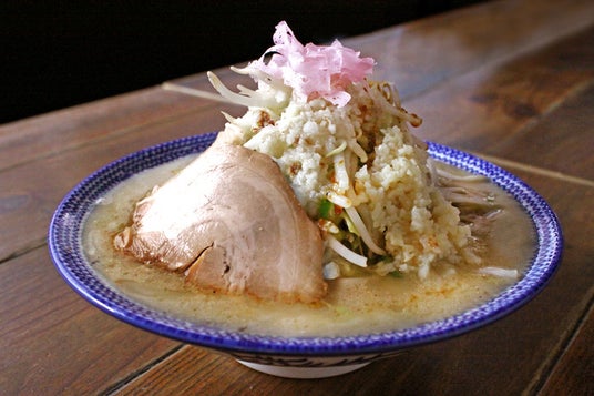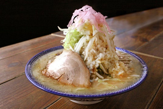 熟成鶏豚骨スープともちもち食感の自家製多加水麺の白ちゃんぽんに、二郎系の象徴でもあるキャベツともやしの他、ちゃんぽんに欠かせない人参、玉ねぎ、水菜、きくらげなどを天高く盛り付けました。さらにチャーシュー、刻みニンニク、削りかまぼこをトッピング。背徳感ある味わいは一度食べると病みつきになること必須です!