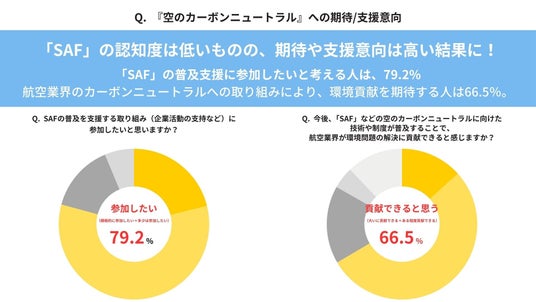 さらに、「SAF」の普及を支援する取り組みへの参加意向を調査したところ、約8割(79.2%)が参加したいと回答。加えて、「SAF」などの空のカーボンニュートラルに向けた技術や制度が普及することで、航空業界が環境問題解決に貢献できると答えた人は66.5%でした。
