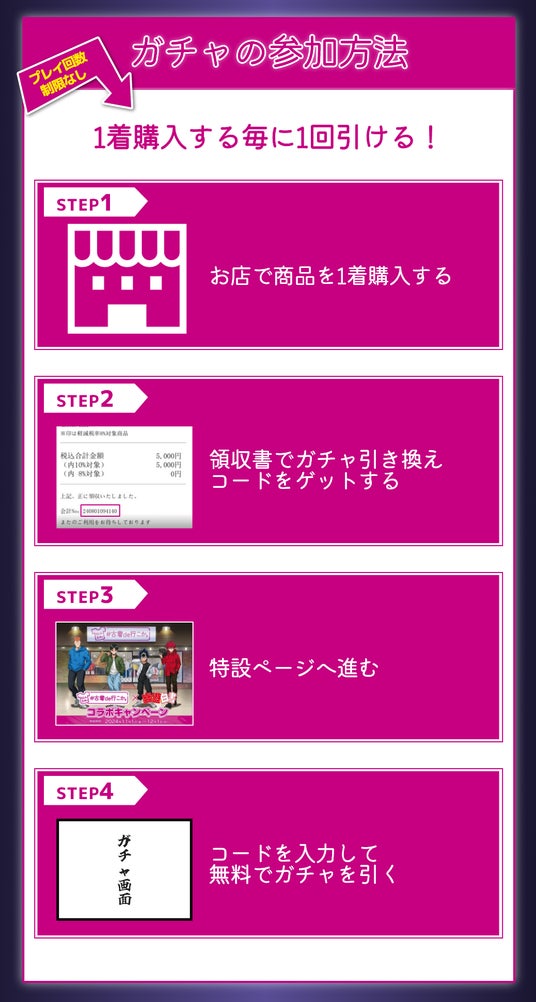 おひとり様あたりのプレイ回数に制限はなく、シリアルコード1つにつき1回店舗連動ガチャをプレイいただけますので、期間中は『#古着de行こか。』でお買い物をいただく度にガチャをプレイしていただけます。