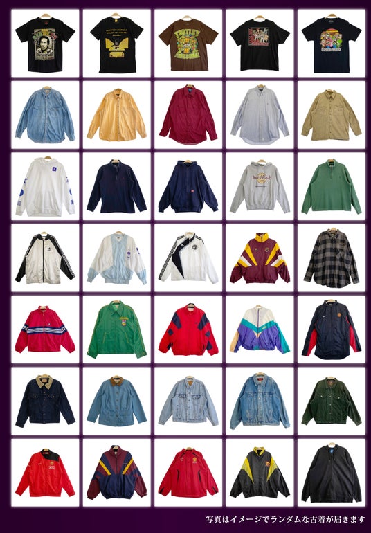 古着はノーブランド品からNIKE、Championなどの人気ブランド品まで、Tシャツ、シャツ、パーカー、トレーナー、ナイロンジャケット、コートなど多様なジャンルからランダムで3着以上をお届けします。