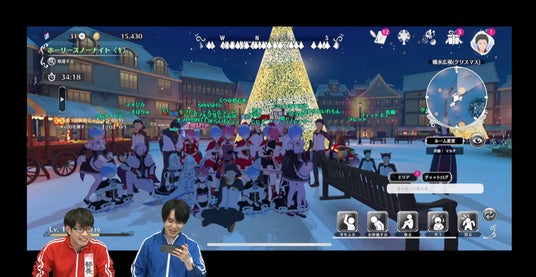 そのあと、『リゼウィチ』の続きをプレイ。あまりにプレイヤーが集まってしまった前半パートを振り返り、待ち合わせ場所と合言葉は会員限定コーナーの中で発表となりました。しかし会員限定コーナーが始まる前にユーザーに見つかっており、ゲーム画面に切り替えると待ち合わせ場所はいっぱいに。あまりの混雑で操作にも影響が出てしまい、探索しようにも迷ったり場所がループしてしまったりするなど、豊永も小林も結局お互いを見つけられず「声優ゲーム部の中でも歴代のグダグダ感」と爆笑。最後はクリスマス衣装を着たたくさんのプレイヤーと記念撮影し、楽しい雰囲気で終了しました。
