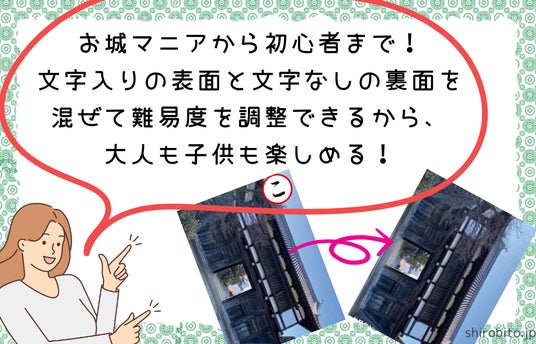 絵札は「城郭名の頭文字いり」と「画像だけ」のリバーシブル仕様。参加者に応じて難易度を自由に変えられます。