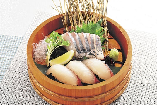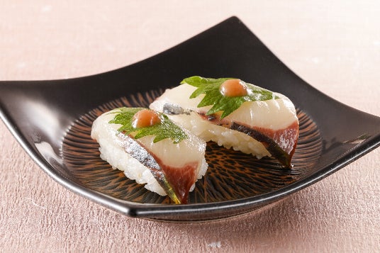 外見は青魚ですが、白身魚とアジの中間のような、両方の美味しい部分を兼ね備えている味わいの『縞鰺』には梅肉としそを添えて、さっぱりとお召し上がりいただきます。