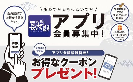 にぎり長次郎をお得にご利用できる、公式アプリを配信しています。