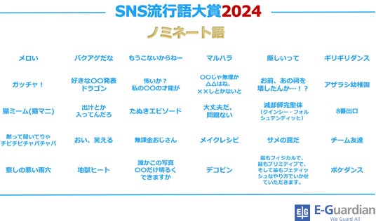 イー・ガーディアンは、総合ネットセキュリティ企業として投稿監視、本人確認、広告審査、ソーシャルリスニング、サイバーセキュリティのほか、メタバース領域までにおけるインターネット世界の安心・安全の実現に向け、ネットセキュリティに関するあらゆる課題をワンストップでサポートしております。日々のソーシャルリスニングで蓄積したデータをベースに、イー・ガーディアンが今年X(旧Twitter)上で広くつぶやかれたワードを独自で調査し、その年に最も多く投稿された(バズった)ワードを決める「SNS流行語大賞」、2024年度は上記の30ワードがノミネートされました。
