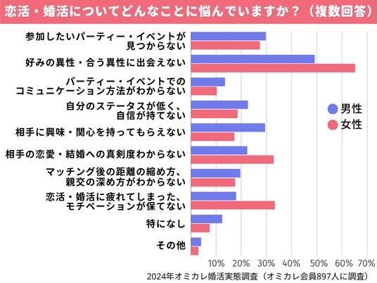 また、男性は「パーティー・イベントでのコミュニケーション方法がわからない」「自分のステータスが低く、自信が持てない」「相手に興味・関心を持ってもらえない」と、自分自身についての悩みを抱えている人も多いという結果に。
