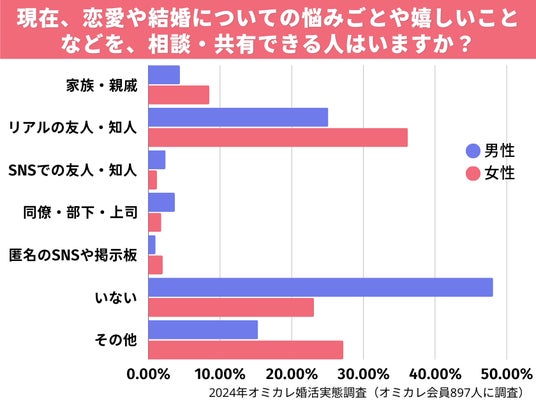 しかし一方で、女性の約25%、男性の約50%は、恋愛・結婚について相談できる人が「いない」と回答。