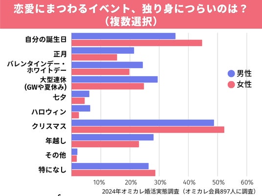男女共に、約50%の人が「クリスマス」は独り身にはつらい、と回答。