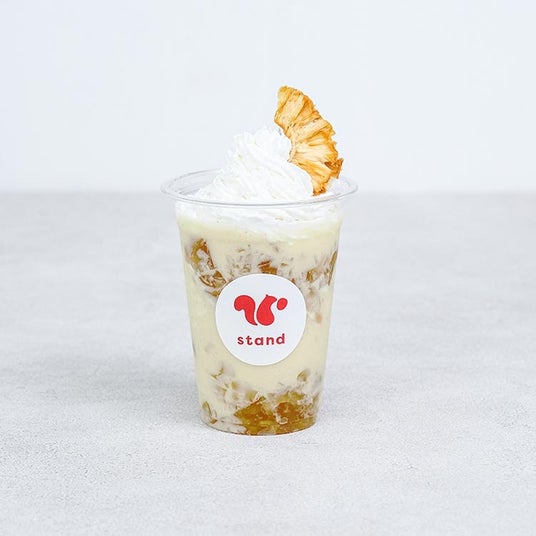 スナックミーのおやつの中でも大人気のドライフルーツ「プレミアムドライパイン」をホイップの上にトッピングした、パイナップルを贅沢に味わえる一杯。さっぱりとしたパイナップルとマスカットの香りがする有機エルダーフラワーシロップのゼリーとのハーモニーを楽しむことができます。