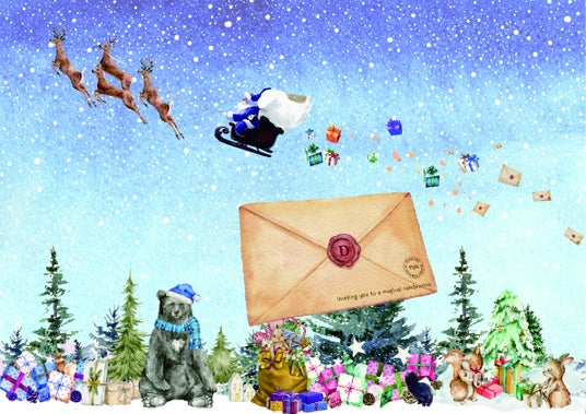 ダイナシティオリジナルのブルーサンタが登場!STORY:お祝いパーティへの招待状とプレゼントを積んで出発したサンタクロース。しかし、大きな袋には穴が開いており中身が散らばってしまうアクシデントが!森の動物たちがあわててプレゼントを集めてくれていますが、無事にパーティを開催できるのでしょうか…。