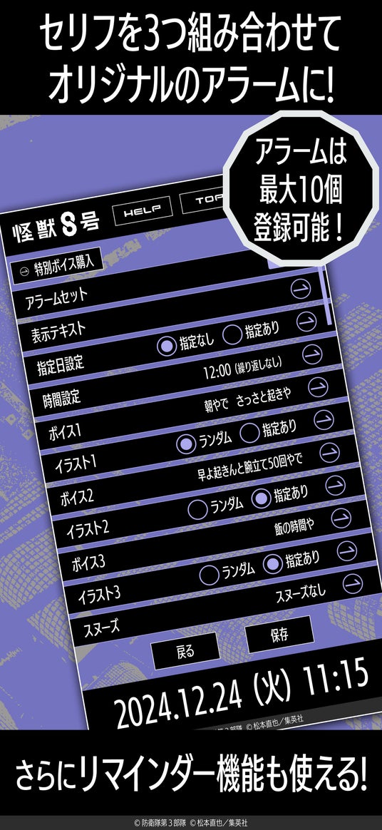 『怪獣8号』保科宗四郎アラームは、アニメ『怪獣8号』に登場するキャラクター・保科宗四郎(CV:河西健吾)のボイスを収録したアラームアプリです。おなじみのセリフから新しいセリフまで、このアプリのために収録した録り下ろしボイスが多数実装されています。