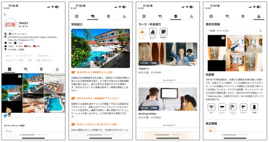 ネイティブキャンプ留学では、ユーザーが情報を分かりやすく把握できるよう、常に丁寧な情報提供を心がけています。TARGETの詳細情報は、以下の4つのカテゴリーに分けて掲載しており、知りたい情報を的確にお届けします。
