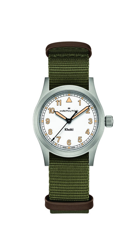 「カーキ フィールド クォーツ」は、1960年代に英国政府の非軍人向けに製造された「ハミルトンG.S.」("General Service")にインスパイアされました。最新の「カーキ フィールド クォーツ」コレクションには、視認性とコントラストを最適化したダイヤルや鉄道線路を模した分目盛など、オリジナルモデルのデザイン要素が盛り込まれています。針、インデックス、数字のスーパールミノバ(R)コーティングは、光り輝くホワイトに加え、1970年代まで使用されていたラジウムを彷彿とさせるグリーンの2色からお選びいただけます。