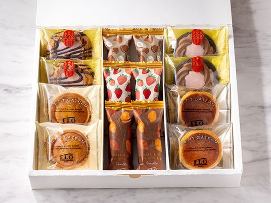 内容:プティタルト(あまおう苺、アップルシナモン)各2個、クッキーフルール(ココア苺、ラインチョコ苺)各2個、ミルフィーユ(バニラ、ヘーゼルナッツ、苺)各2個