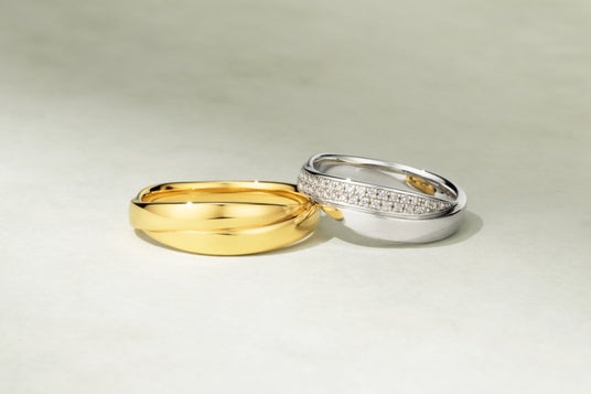 輪が重なり合うデザインで、共に歩む二人の絆を表現した『ダイナ』。ボリュームのあるダイナミックなフォルムで、ひとつ着けるだけで存在感を放ち、リュクスな手元が叶います。2本のリングを重ねたようなデザインでありながら、傷つきにくくサイズ直しも可能な造りであるのも魅力です。