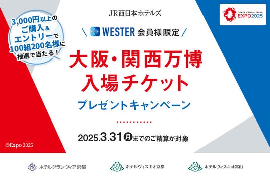 株式会社ジェイアール西日本ホテル開発(京都市下京区、代表取締役社長 伊勢正文)が運営するホテルグランヴィア京都(総支配人 右京和正)は、同ホテルが運営する対象施設(ホテルグランヴィア京都、ホテルヴィスキオ京都、ホテルヴィスキオ富山)にて、1会計あたり3,000円以上ご利用のお客様から抽選で入場ペアチケットが当たる「大阪・関西万博入場チケットプレゼントキャンペーン」を、2025年2月3日(月)より実施いたします。