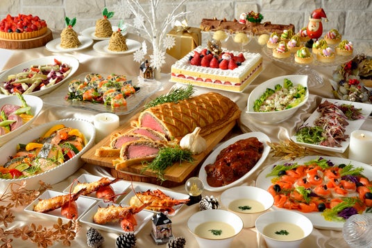 世界三大珍味を使用した牛フィレ肉とフォアグラのパイ包み焼き ウェリントン風トリュフソースなどの西洋の伝統的なクリスマス料理のほか、ドイツの「三大B」が愛した料理、お子様も喜ぶチキンオムライスやマカロニチーズに目の前で切り分ける大きなクリスマスショートケーキや目の前で仕上げるモンブランなど、ホテルのビュッフェならではの、料理やスイーツを多彩に取り揃えています。