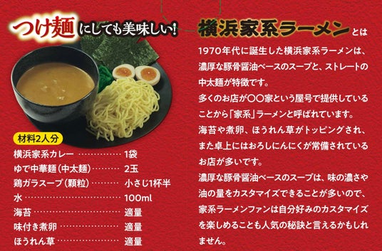 「横浜家系ラーメン」がレトルトカレーになって新登場。濃厚な豚骨醤油ベースのスープをイメージしたカレールーで、あのクセになる味わいをお楽しみいただけます。