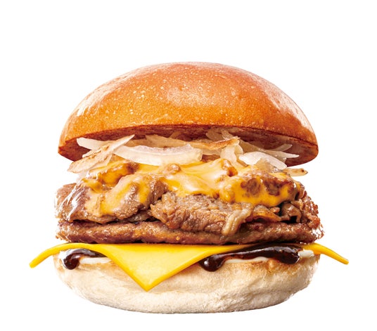「フィリーチーズステーキバーガー」は、ハンバーグパティに、甘辛く味付けした牛カルビ肉ととろ~り濃厚なレッドチェダーチーズソース、シャキシャキ食感のグリルドオニオンを合わせ、スライスチーズ、オリジナルBBQソースなどとともにふんわりもっちり食感のバンズで挟んだ商品です。レッドチェダーチーズソースがとろ~り絡んだ甘辛い牛カルビ肉と、ほんのり甘く香ばしいグリルドオニオンの相性が抜群な一品に仕上げました。