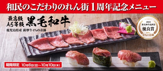 ワタミ株式会社(本社:東京都大田区、以下ワタミ)が運営をする、和民のこだわりのれん街が10月5日で1周年を迎えます。日頃からご利用いただいているお客さまに感謝の気持ちを込め、1周年記念メニューの販売をご用意いたしました。10月6日(日)~10月10日(木)の期間限定で最高級A5ランクの鹿児島県産の薩摩牛を使用した商品で一頭から4%しか取れない部位を使用した「ローストビーフ~天日塩・生ワサビ添え~」「ローストビーフ寿司~特製たれ~」は外食ならではの特別メニューです。