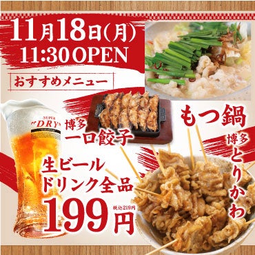 11月18日(月)・19日(火)・20日(水)の3日間限定 で、名物の 「一口餃子」無料食べ放題 を実施!どなたでも制限なく何個でも楽しめるこの機会に、ぜひ博多の味を堪能してください。