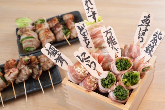 新鮮野菜を豚肉で巻き、丁寧に焼き上げた博多スタイルの野菜巻き串。さっぱりしながらも食べ応えがあり、女性にも人気です。