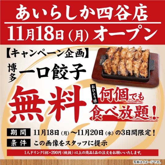 西新宿で大好評の「博多酒場 あいらしか」が、ついに四ツ谷に進出!四ツ谷店ではオープンを記念して、 一口餃子の無料食べ放題 を18日・19日・20日3日間限定で開催します!(提供時間14時~)
