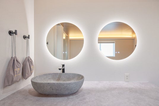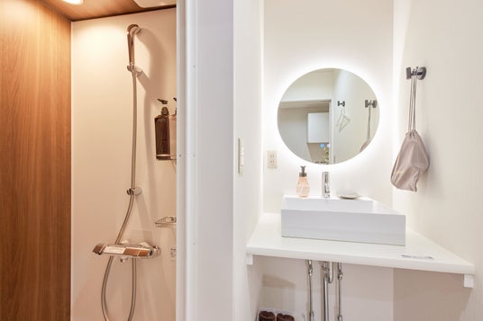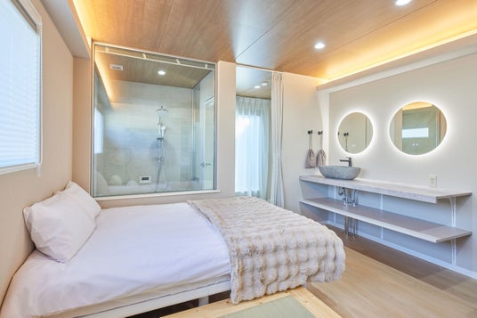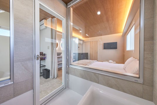 寝室内には解放感のある浴室とeni.施設のシンボルである円形ミラーの造作洗面を設置。天井の関節照明と相まって、ゆったりした雰囲気で夜の時間を過ごしていただけます。