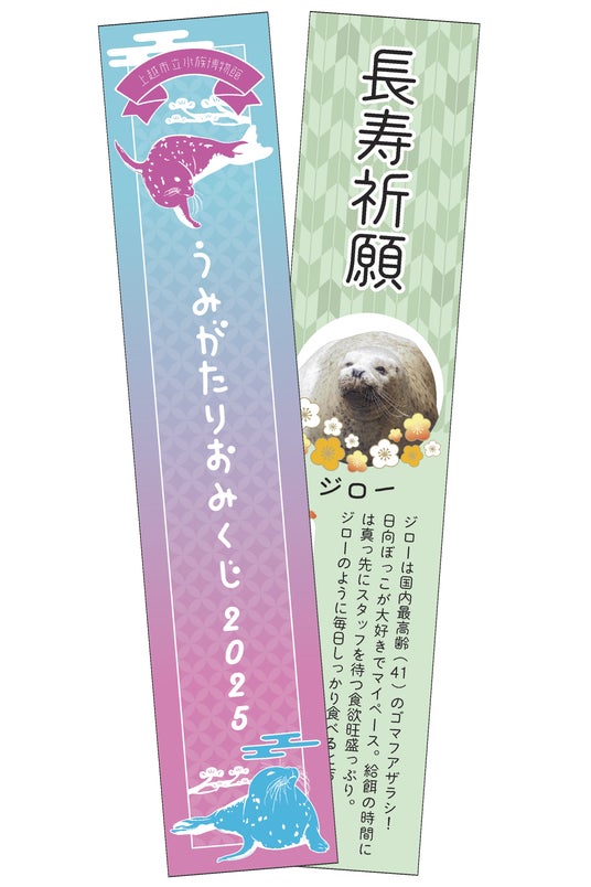 今年は、『うみがたり』のゴマフアザラシ6頭が出てくる計6種類!個体の性格になぞらえた少しユニークな運勢が記載されています。1年の始まりに引いてみてはいかがでしょうか?