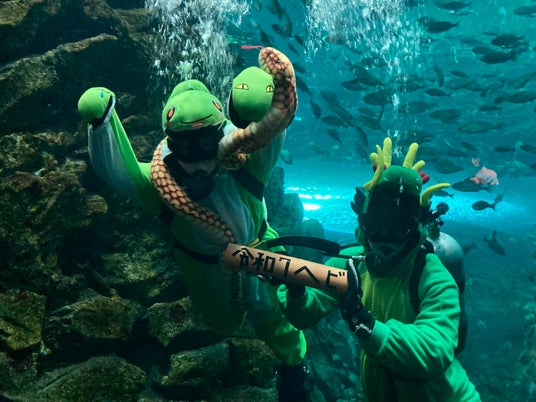 エントランスには門松を設置し、お正月らしい装飾が施された館内で、干支水槽や干支ダイバーなど令和7年の干支「巳」にちなんだ展示やイベントを実施します。そのほか人気の水中ドルフィンパフォーマンス「Art of Dolphin」がニューイヤーバージョン(以下、「ニューイヤーver.」)になり、『うみがたり』の生きものが新年を祝います。