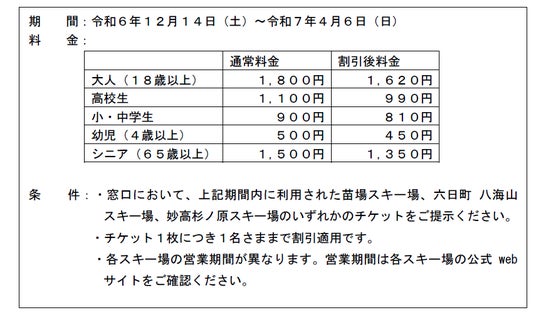 当館利用時に苗場スキー場、六日町 八海山スキー場、妙高杉ノ原スキー場のチケットをご提示いただくと、お得に『うみがたり』をご利用いただけます。