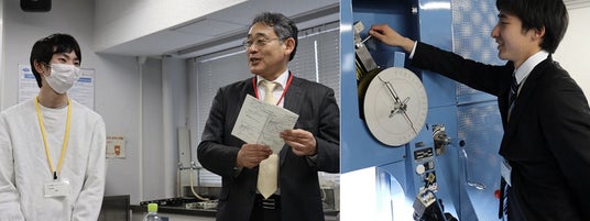 左:交流会にて久留米高専の松村校長が久留米高専学生を参加者へ紹介する様子 右:2024年3月のマテリアルコンテストでシャルピー衝撃試験する当時5年生の学生