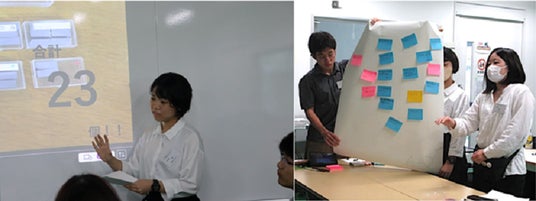 左:本年度の加工熱処理のアイデア出しのためプレゼンテーションをする昨年度のマテリアルコンテストを経験した2年生学生 右:4グループに分かれて今後の加工熱処理のアイデアを検討し、発表する様子
