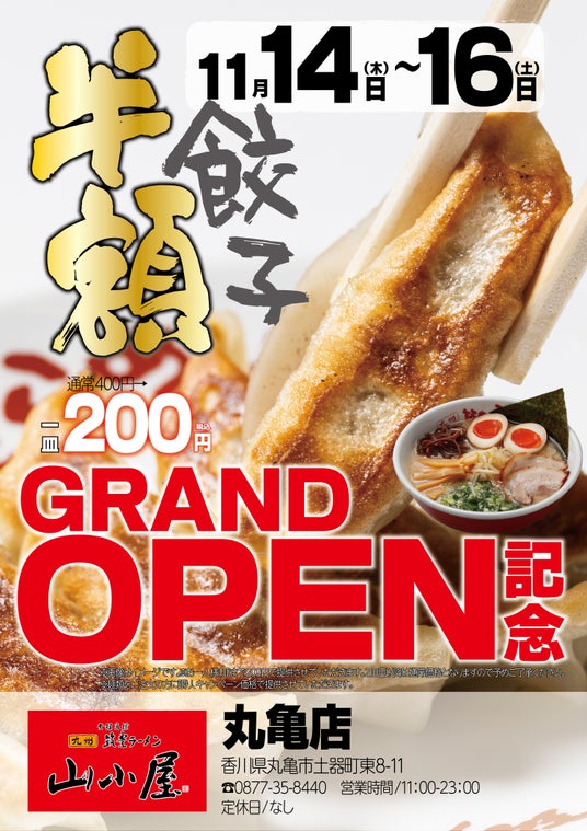 「山小屋 丸亀店」の新規オープンを記念し、11月14・15・16日の3日間限定で「山小屋」特製餃子の半額イベントを開催します。