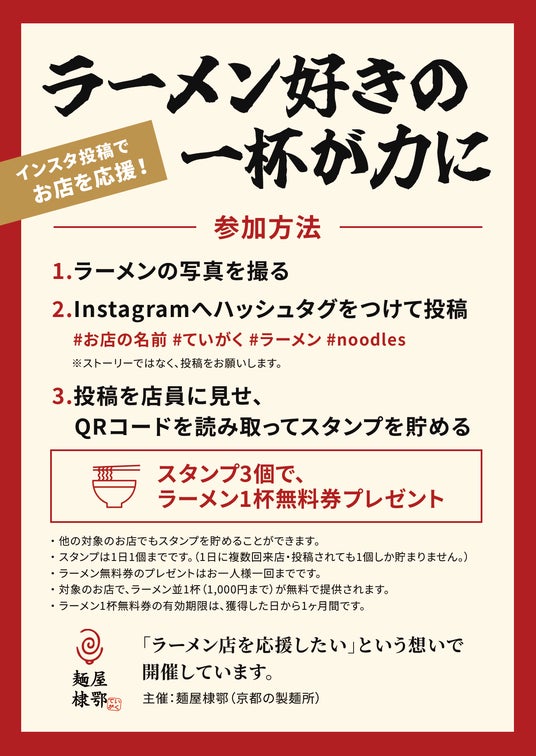 「ラーメン好きの一杯が力に!」キャンペーンは、こういった背景から様々なラーメン店により足を運んで頂き、ラーメン店を応援することを目的としております。期間中、対象のお店のうち3店舗でラーメンを食して頂き、Instagram上に対象店舗名および麺屋棣鄂(#ていがく)をタグ付したうえで写真を投稿頂くとラーメン一杯無料券をプレゼントいたします(先着100名様まで)。