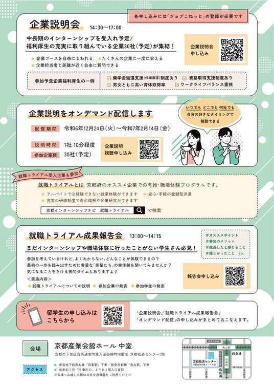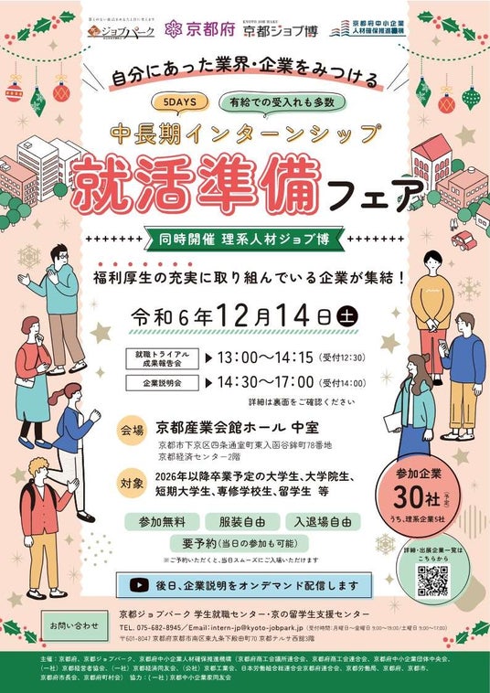 ■京都府では、中長期・有給インターンシップの受入れを希望する京都企業30社が出展する企業説明会を12月14日に開催します。