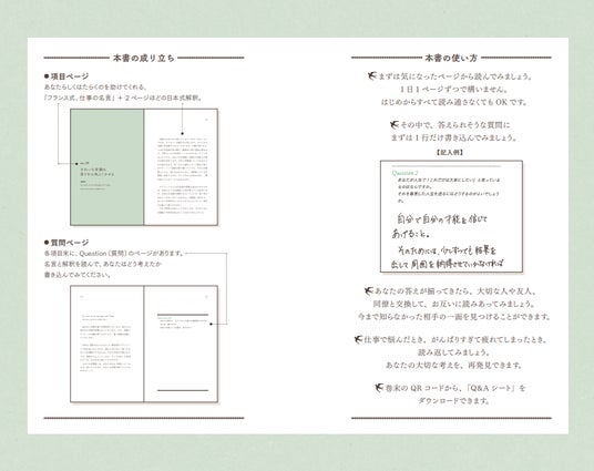 そこで本書では、1つずつ答えていく中で、「自分は、本当は何を大切にして生きていきたいのか?」が明確になる40個の質問をご用意しました。それぞれの質問に合わせて、思い詰めていた毎日にちょっとしたゆとりをもたらしてくれる、フランスのことわざやエピソードをご紹介。日本在住のフランス人夫婦が、はたらく全ての日本人に伝えたい、仕事でもプライベートでも幸せになる秘訣がたっぷり詰まっています。「本に書き込むのはちょっと……」という方のために、書き込み用のシートをダウンロードすることもできます。