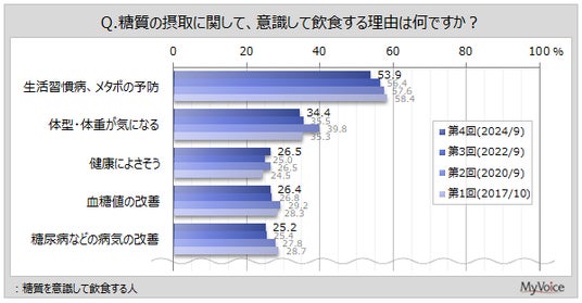 糖質を意識して飲食する人に、理由を聞いたところ(複数回答)、「生活習慣病、メタボの予防」が53.9%、「体型・体重が気になる」が34.4%、「健康によさそう」「血糖値の改善」「糖尿病などの病気の改善」が25~27%となっています。