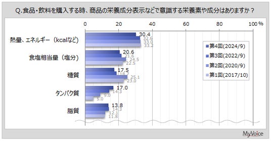 食品・飲料購入時に意識する栄養素や成分は(複数回答)、「熱量、エネルギー」が30.4%、「食塩相当量(塩分)」が20.6%、「糖質」「タンパク質」が各2割弱となっています。過去調査と比べて、「タンパク質」が増加傾向です。