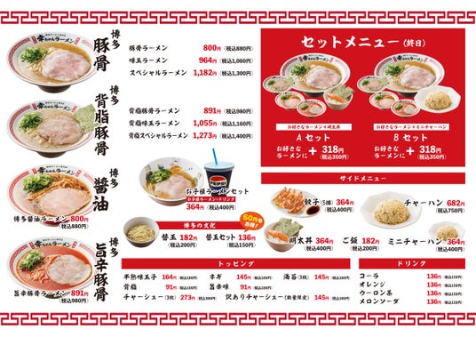 世界10カ国90店舗以上を展開、ラーメンのグローバルブランド、博多一幸舎や幸ちゃんラーメンを運営する、株式会社ウインズジャパンホールディングス(所在地 福岡県福岡市博多区、代表取締役社長 吉村 幸助 以下当社)は、この度、博多一幸舎ららぽーと立川立飛店をブランドリニューアルし、博多ラーメン専門店『幸ちゃんラーメン ららぽーと立川立飛店』として都内初出店、ららぽーと立川立飛3階フードコート内に2025年2月6日(木)オープンいたします。幸ちゃんラーメンのブランドコンセプトは、豊富なラーメンラインナップや、食べやすいサイズのお子様ラーメン、ラーメンと相性抜群の餃子や明太丼などのサイドメニューが充実しているところです。そのため、おひとりさまからファミリーさま、⽼若男女問わず幅広い方達より、本場博多の町豚⾻(※)として支持いただいています。また、「幸ちゃんラーメン」は2020年福岡県の初出店から、約5年で国内19店舗、海外2店舗を出店、今後も出店エリアを拡大していく予定です。是非、本場博多の味、町豚⾻で親しまれている「幸ちゃんラーメン」へ足をお運びください。(※町豚⾻:シンプルで毎日食べても飽きのこない、生活の中に溶け込んだ町のラーメン屋としています。)