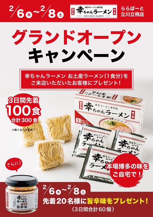 【元祖泡系博多一幸舎】プロデュース、「幸ちゃんラーメン(こうちゃん)」が2025年2月6日(木)ららぽーと立川立飛にグランドオープン!当日はオープン特典をご用意しています!
