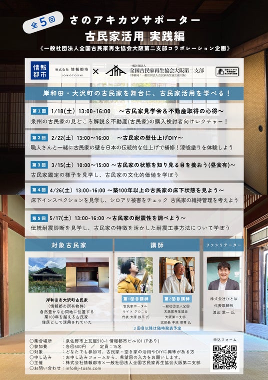 株式会社情報都市は、一般社団法人全国古民家再生協会大阪第二支部とのコラボレーション企画として、2025年に「さのアキカツサポーター 古民家活用 実践編」を開催します。