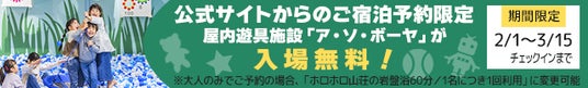 ご宿泊2月1日~3月15日チェックインまでの期間、公式ホームページからご予約の皆様に屋内遊具施設「ア・ソ・ボーヤ」入場券のプレゼントキャンペーンを開始します。既にご予約のお客様も対象となります。