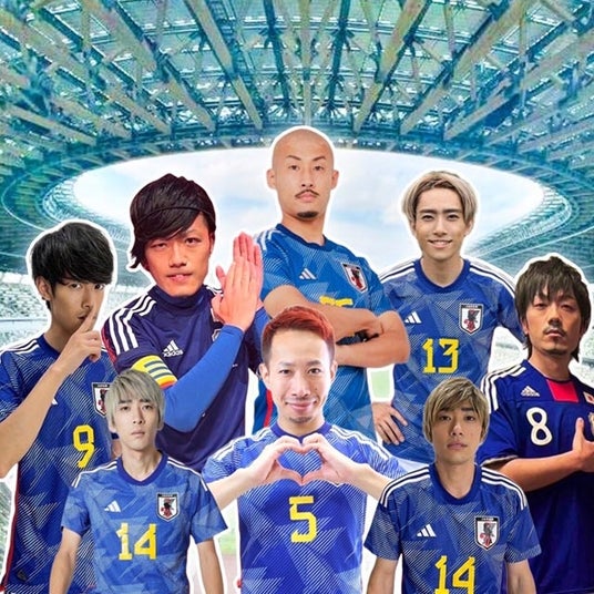 サッカー日本代表ものまね軍団「ものまねブルー」です。ホンモノのサッカー日本代表が試合をする神聖なる国立競技場の地に立てる事を光栄に思います。私達もご本人様に負けず劣らず健脚揃いです。当日は、一緒に競い、励まし合い、おもいっきり楽しみましょう!