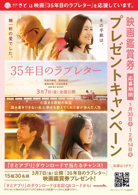 国内197店舗を展開する「和食さと」では、公式「さと アプリ」をダウンロードしているお客さまへの限定企画として 、3月7日(金)に公開される映画 『35年目のラブレター 』 の映画鑑賞券15組 30名様 が当たるプレゼントキャンペーン を1月30日(木)~2月14日(金)で開催します。さとアプリでは最新情報のお知らせやクーポン配信、来店予約などより便利でお得にご利用いただける機能を提供しており、アプリを通じて多くのお客さまにご来店頂いております。今回さとアプリをご利用頂いているお客さまへのプレゼント企画として、映画『35年目のラブレター 』の映画鑑賞券が当たるキャンペーンを期間限定で実施しますので、たくさんのご応募お待ちしております。当選発表は賞品の発送をもって代えさせていただきます。 詳しい応募方法や応募条件などはアプリ内の応募概要をご確認下さい。
