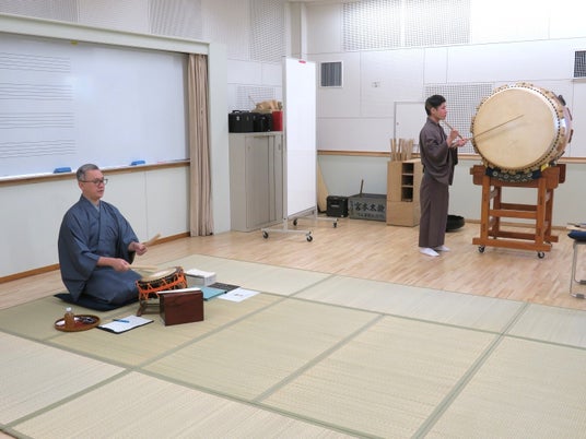 研修課程では、小鼓・大鼓・太鼓・大太鼓・笛の演奏法を学び、鳴物演奏者に必要な技芸や知識を習得します。