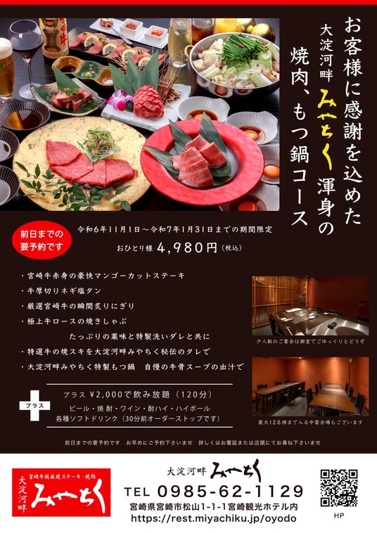 株式会社ミヤチク(本社:宮崎県都城市/代表取締役社長:船ヶ山 祐二)が運営する【大淀河畔みやちく】限定で、お客様へ感謝を込めた”焼肉・もつ鍋コース”を期間限定で2025年1月31日(金)まで販売いたします。