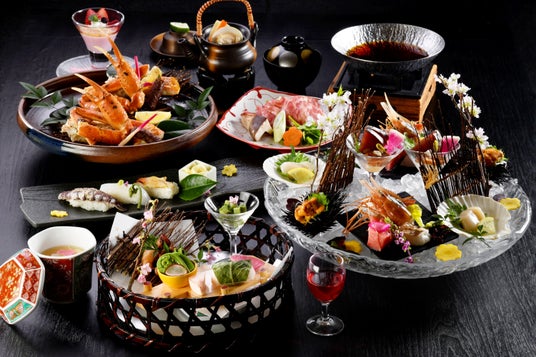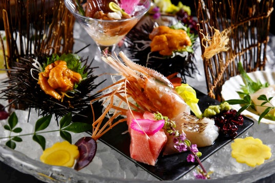 特別会席『初音』の魅力は何と言っても盛込みでご提供する御造りと焼き物。御造りには大きな牡丹海老や殻盛りで提供する雲丹、焼き物にはずわい蟹とキンキをご用意。その他にも白老牛や鮟鱇、蝦蛄など、季節の幸を様々な料理法でご用意。