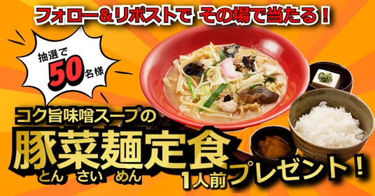 「宮本むなし コク旨味噌スープの豚菜麺定食1人前のデジタルお食事券」を抽選で50名様にプレゼント。