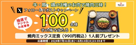 あわせて2024年7月31日(水)~2024年8月13日(火)の期間に「宮本むなし公式Xフォロー&リポストキャンペーン」を実施いたします。宮本むなしの公式Xアカウントをフォローし、キャンペーン投稿をリポストすることで応募でき、その場での抽選で100名様に、定食屋宮本むなし各店舗内で「焼肉ミックス定食(990円税込)」1人前をお召し上がりいただけるデジタルお食事券が当たるキャンペーンです。ぜひこの機会に宮本むなし公式Xのフォロー&リポストでのご参加をお待ちしております。